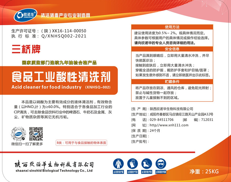 1.三橋牌食品工業(yè)酸性清洗劑(XNHHSQ-2型)是一種無色或淡黃色透明、無泡、濃縮的液體高效酸性清洗劑,能強力去除頑固復雜的礦物質污垢、乳垢,在堿性清洗完成后,用它作為酸性清洗劑,能有效防止奶石、石灰質及其他礦物質污垢的積聚。