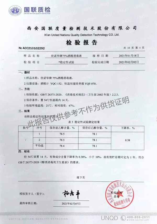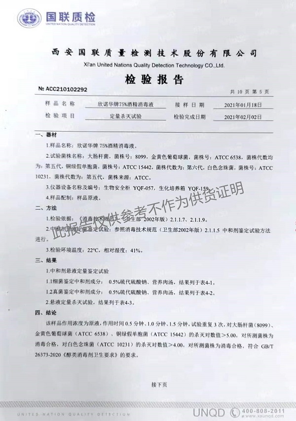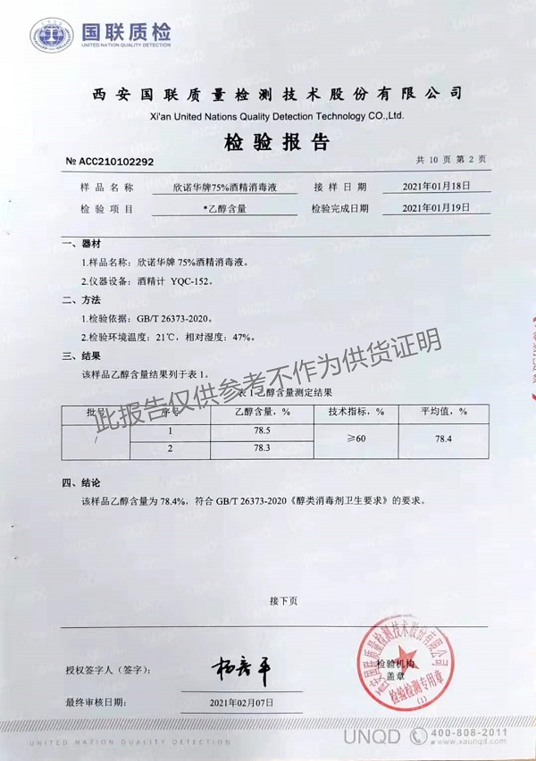 欣諾華牌75%酒精消毒液 檢測(cè)報(bào)告(2021年度)-陜西欣諾華生物科技有限公司