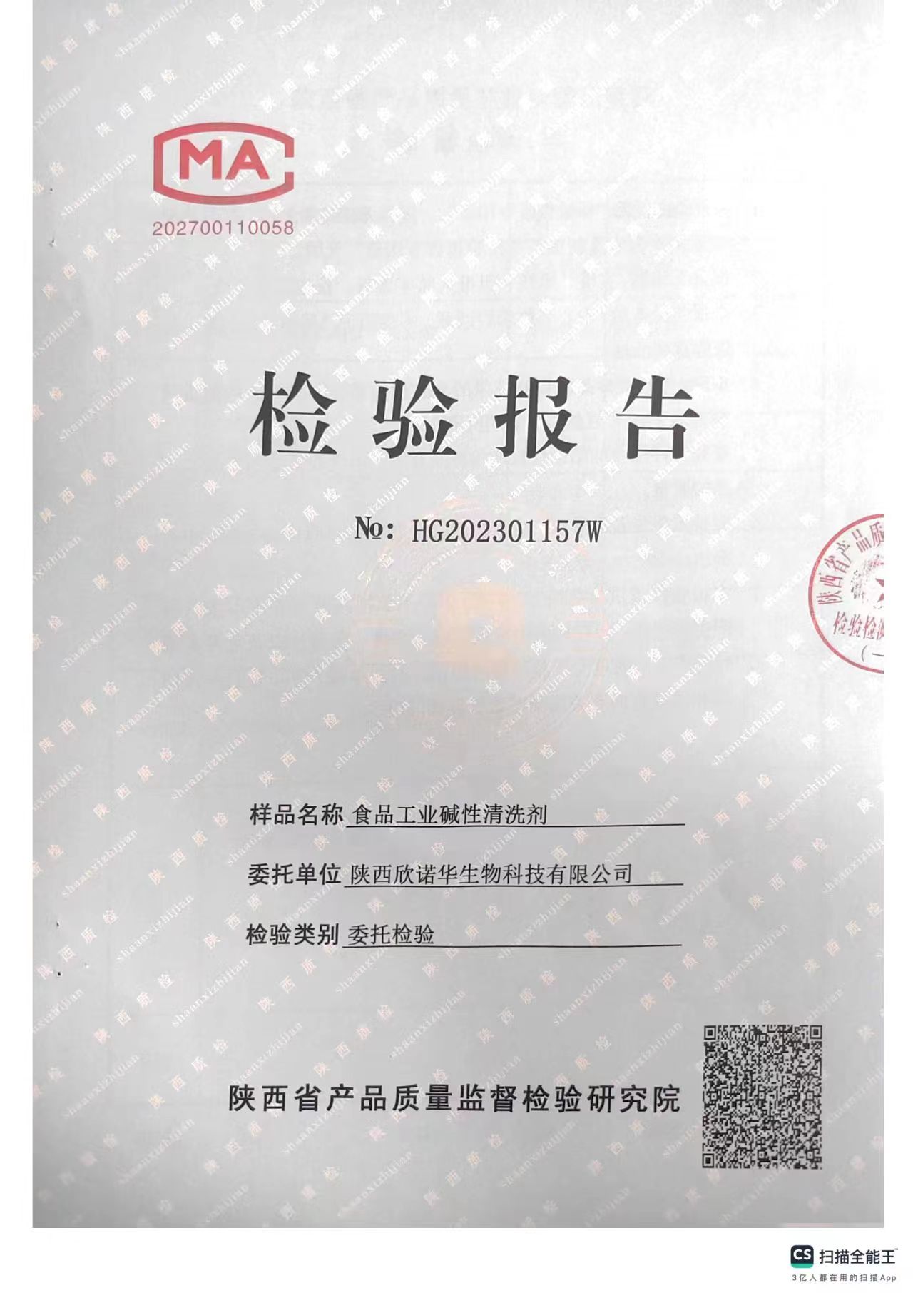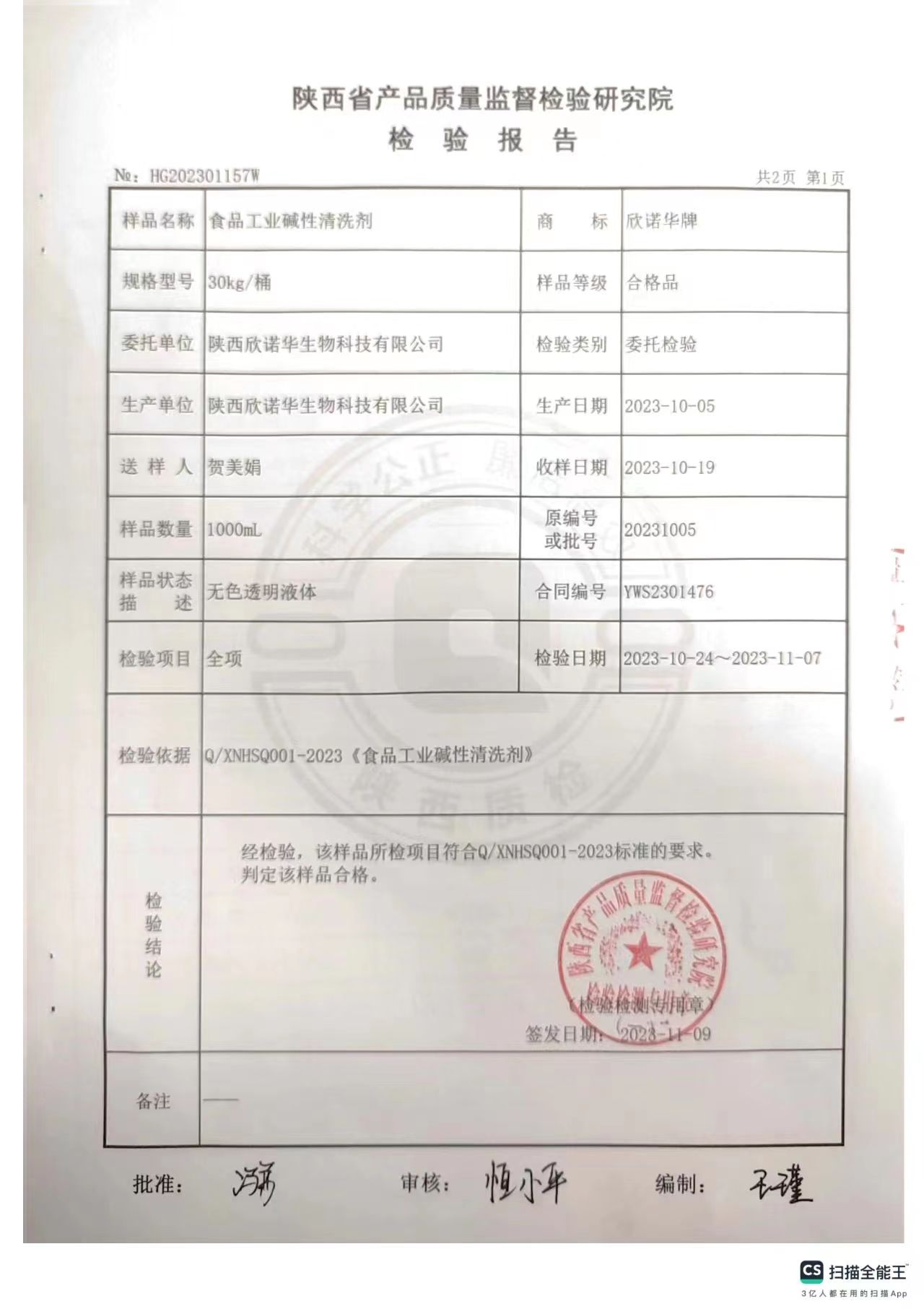 食品工業(yè)堿性清洗劑檢測報告(2023年度)-陜西欣諾華生物科技有限公司