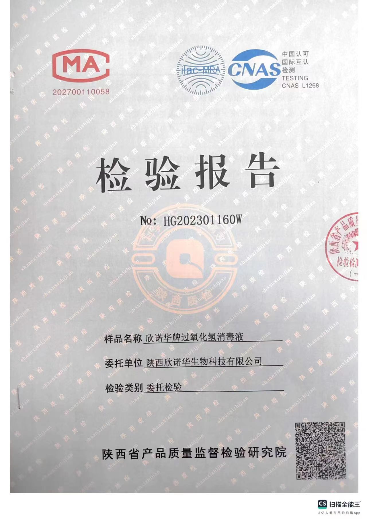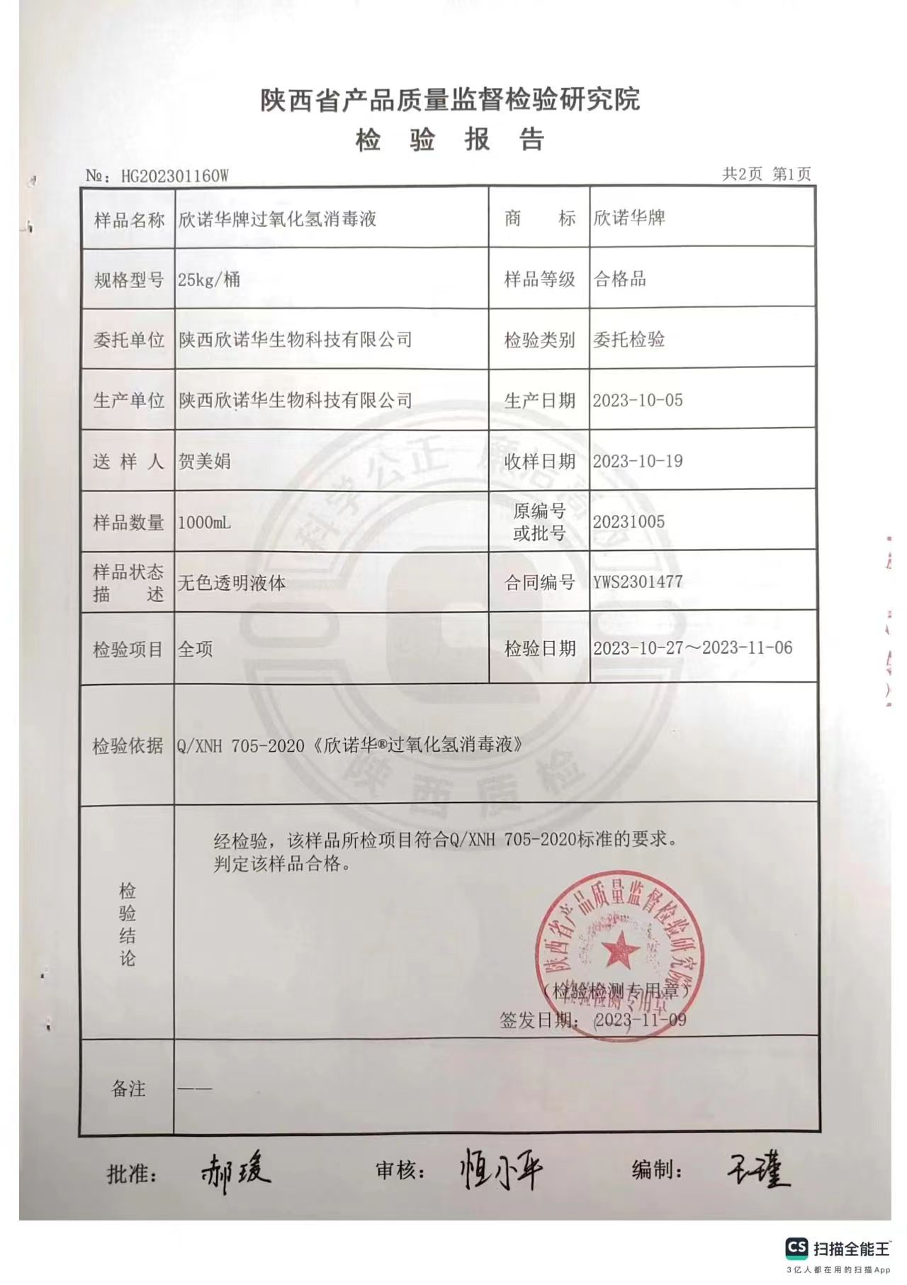 欣諾華牌過氧化氫消毒液(食品級雙氧水)檢測報告(2023年度)-陜西欣諾華生物科技有限公司